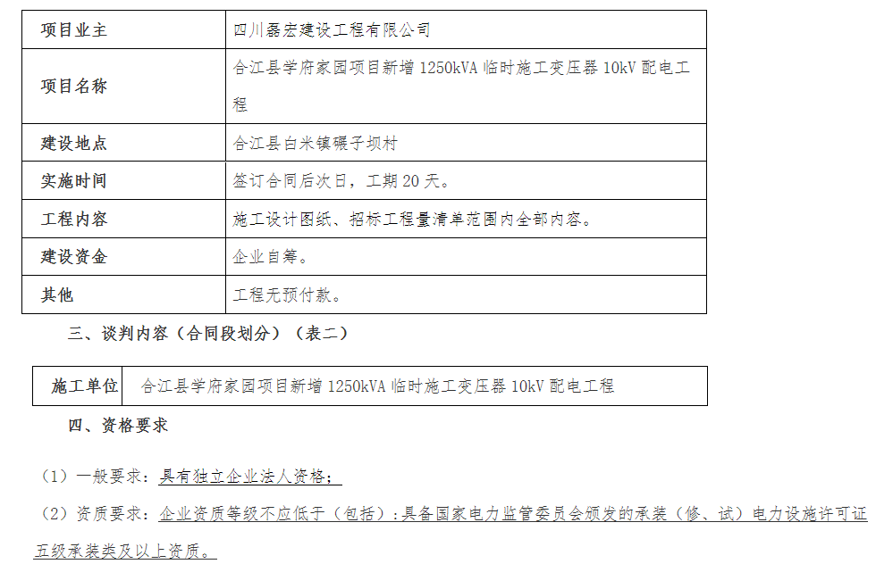 一 、 本 次 談 判 項 目 合 江 縣 學(xué) 府 家 園 項 目 新 增 1250kVA 臨 時 施 工 變 壓 器 10kV 配 電 工 程 施 工 單 位 , 現(xiàn) 通 過 競 爭 性 談 判方式選擇和確定承包人,誠邀符合資格條件的潛在申請人參與本項目的競爭性談判。