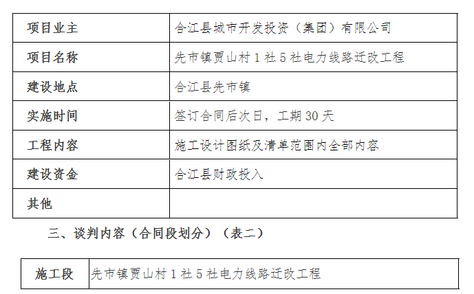 一、 本次談判項(xiàng)目為先市鎮(zhèn)賈山村 1 社 5 社電力線路遷改工程, 現(xiàn)通 過(guò)競(jìng)爭(zhēng)性談判方式選擇和確定承包人, 誠(chéng)邀符合資格條件的潛在申請(qǐng) 人參與本項(xiàng)目的競(jìng)爭(zhēng)性談判。