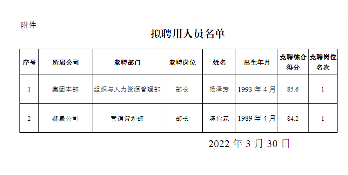 根 據(jù) 《 瀘 州 阜 陽 投 資 集 團(tuán) 有 限 公 司 關(guān) 于 2022 年 部 分 中 層管理崗位內(nèi)部競(jìng)聘的公告》 的規(guī)定,經(jīng)阜陽集團(tuán)黨委研究 決定, 擬聘用楊澤芳、 陳怡霖為瀘州阜陽投資集團(tuán)有限公司 中層管理人員。 現(xiàn)面向社會(huì)公示 3 個(gè)工作日, 公示時(shí)間 2022 年 3 月 30 日至 2022 年 4 月 1 日。 公示期間, 如有問題, 請(qǐng) 及 時(shí) 向 瀘 州 阜 陽 投 資 集 團(tuán) 有 限 公 司 組 織 與 人 力 資 源 管 理 部 反映。 要求舉報(bào)者署實(shí)名, 實(shí)事求是地反映問題, 并提供必 要的調(diào)查線索。