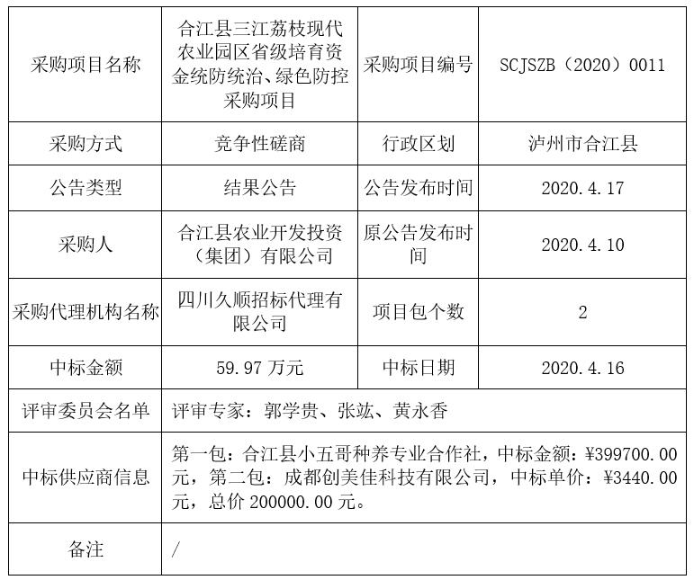 合江縣三江荔枝現(xiàn)代農(nóng)業(yè)園區(qū)省級(jí)培育資金統(tǒng)防統(tǒng)治、綠色防控采購(gòu)項(xiàng)目競(jìng)爭(zhēng)性磋商結(jié)果公告