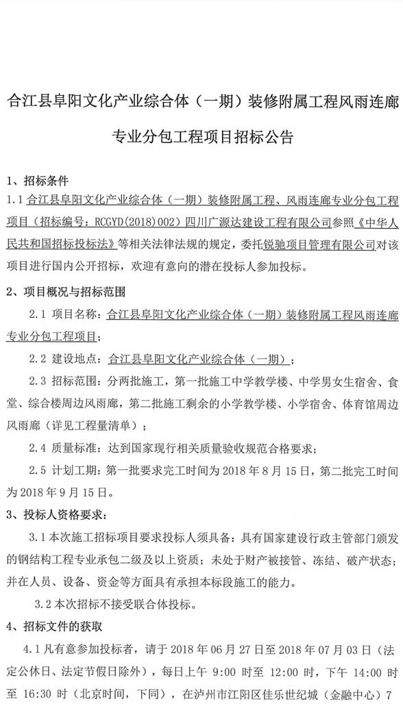 合江縣阜陽文化產業(yè)綜合體(一期)裝修附屬工程風雨連廊專業(yè)分包工程項目招標公告.doc