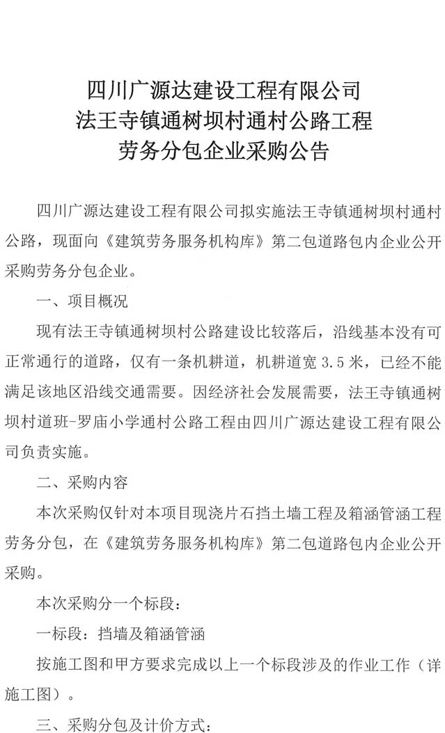 四川廣源達建設(shè)工程有限公司法王寺鎮(zhèn)通樹壩村通村公路工程勞務(wù)分包企業(yè)采購公告.doc